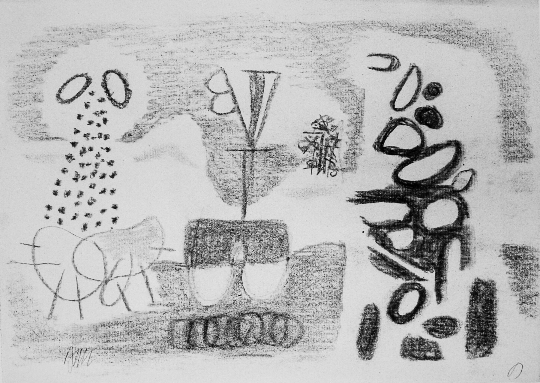 Kohle, Pastell in Gelb, Grün, Blau, Ziegelrot, Violett, Ocker, Weinrot, fixiert, auf chamoisfarbigem Maschinen-Bütten
