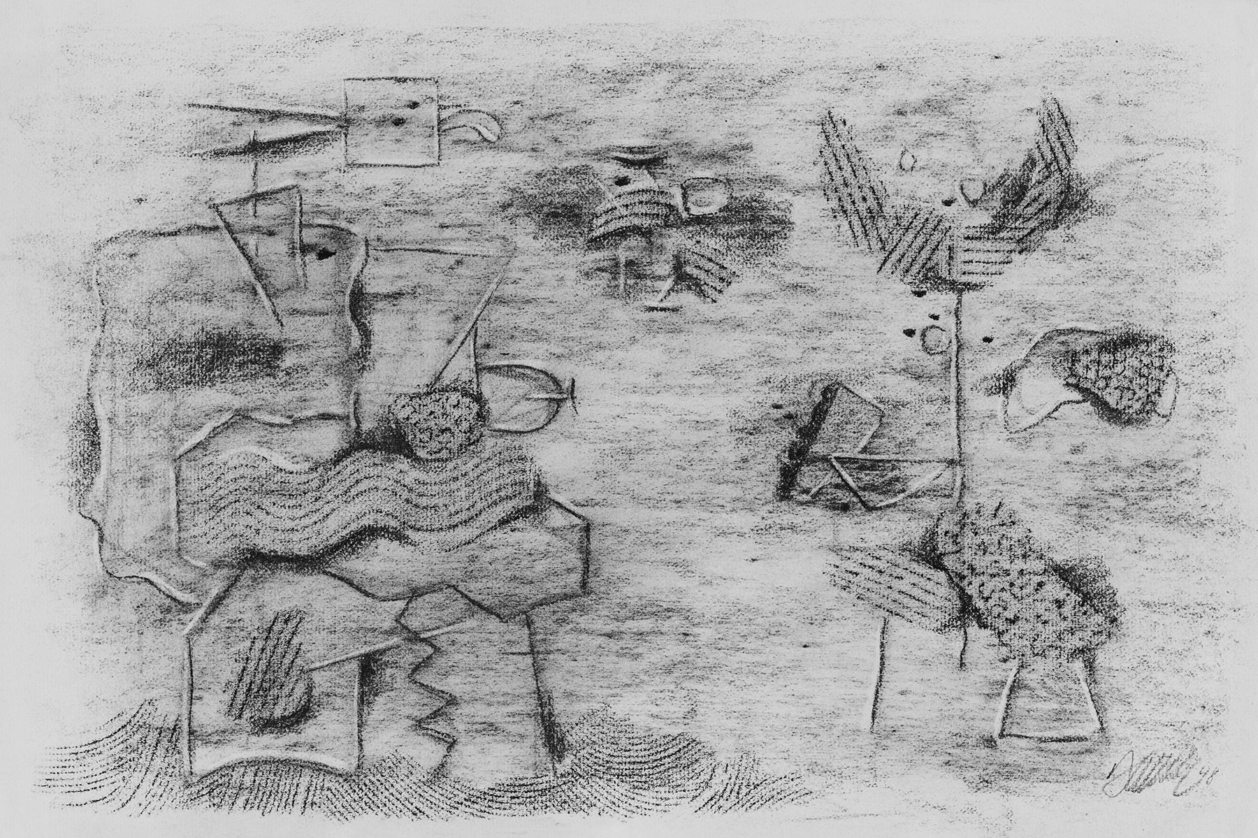 Kohle, gewischt, radiert, Ölkreide in Schwarz, durchgerieben, fixiert, auf chamoisfarbigem Ingres-Bütten mit Wz. r. o.: CANSON & MO...