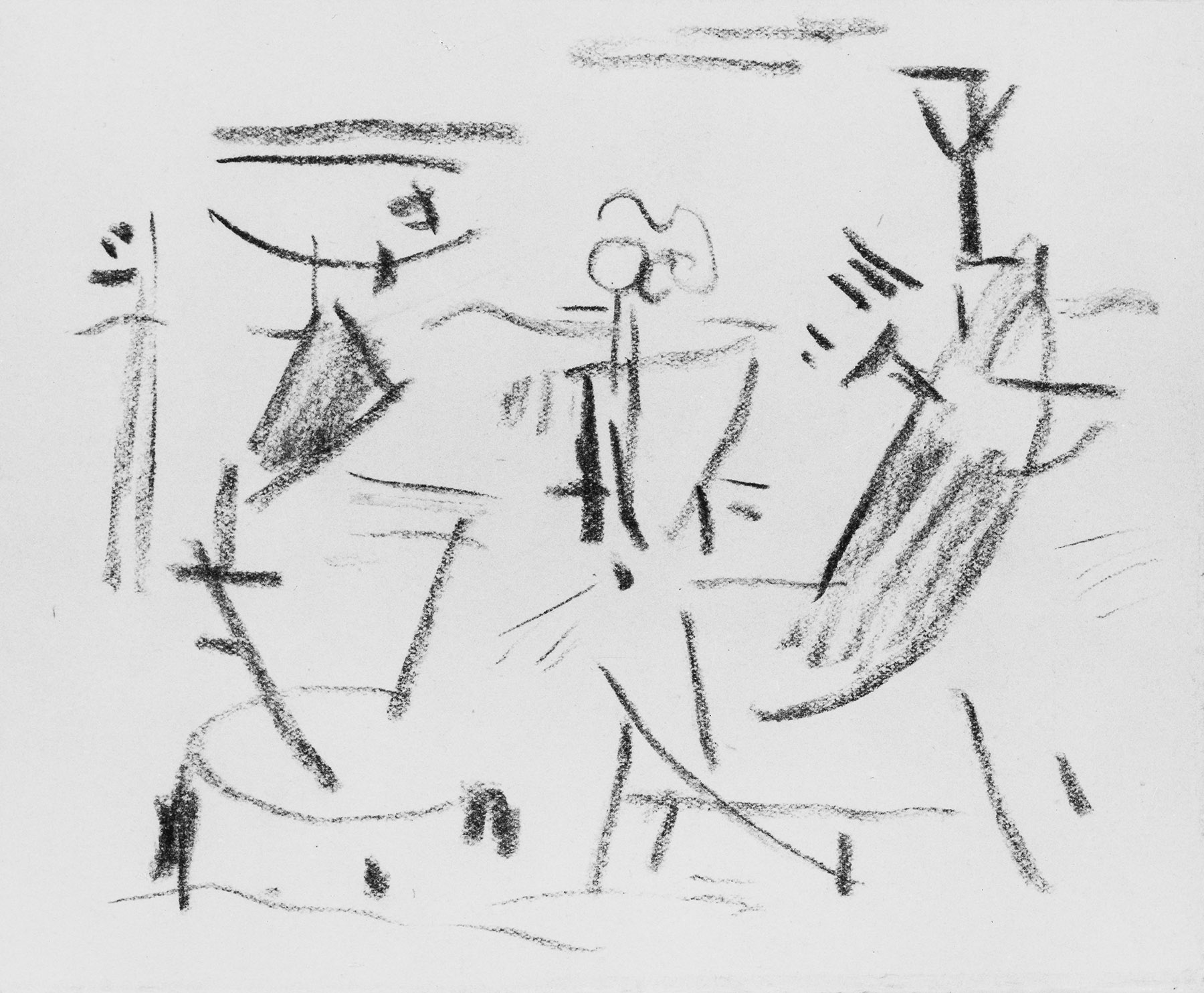 Kohle, auf chamoisfarbigem, am Rand r. und u. im scharfen Knick ausfransend gerissenem Kupferdruckpapier