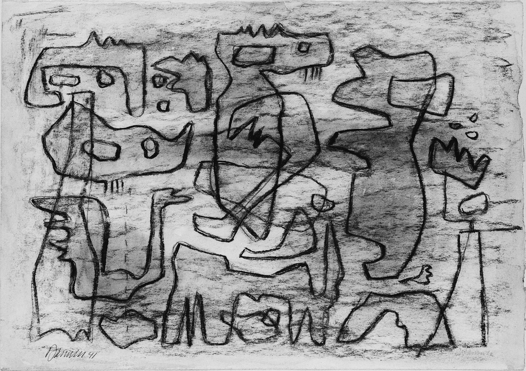 Kohle, Aquarell in Blau, Rot, Gelb, Grün, Violett, Hellbraun, Deckweiß, darüber die Konturen der Kohle (mit leichten Abweichungen) mit hartem Bleistift eindrückend wiederholt, auf chamoisfarbigem, am Rand r. leicht unregelmäßig gerissenem Zeichenkarton