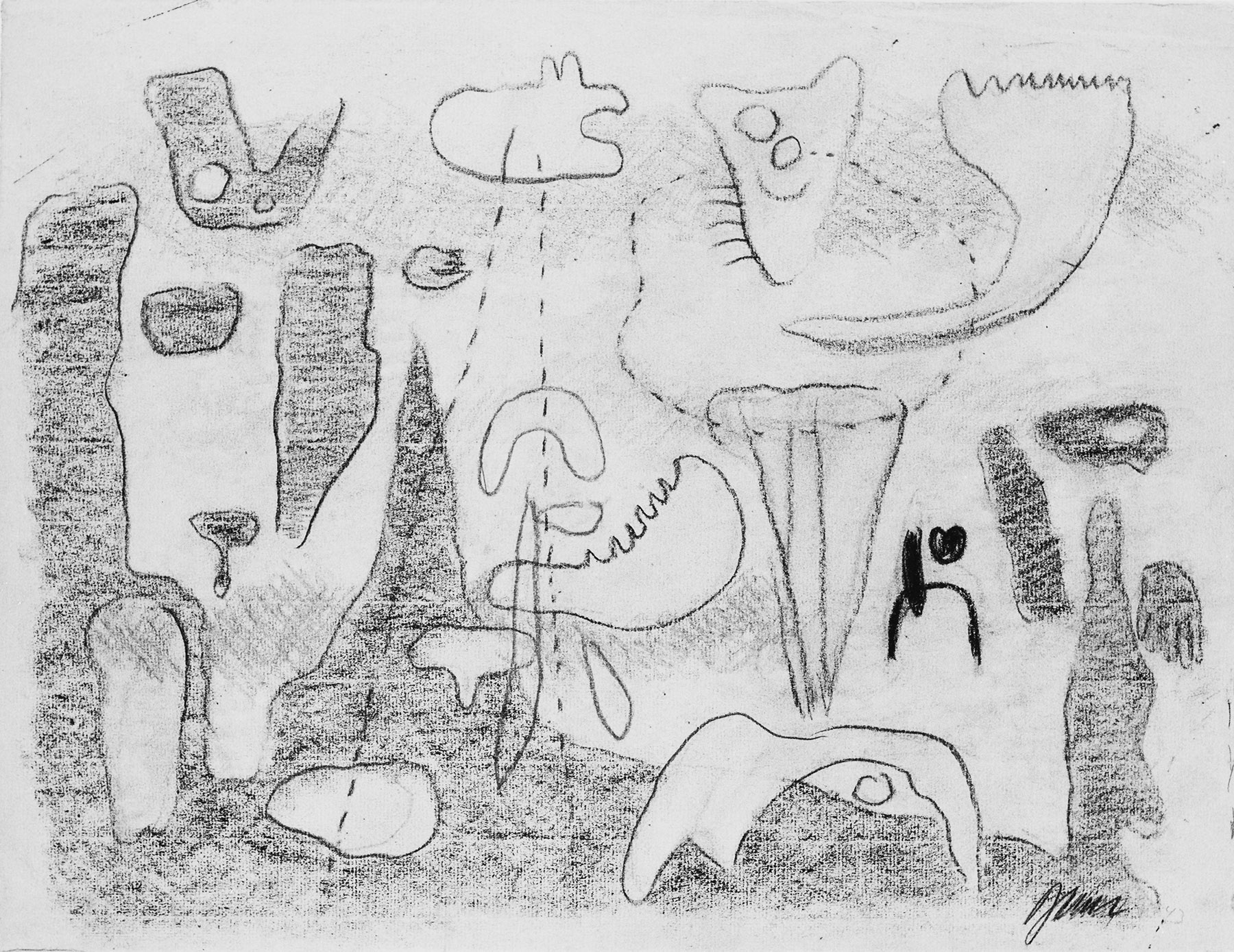Kohle, z. T. gewischt, Ölkreide in Schwarz, Rot, Rosa, Dunkelgrün, Blau, Pastell in Hellgrün, fixiert, auf chamoisfarbigem bis beigefarbigem, am Rand r. unregelmäßig gerissenem Ingres-Bütten