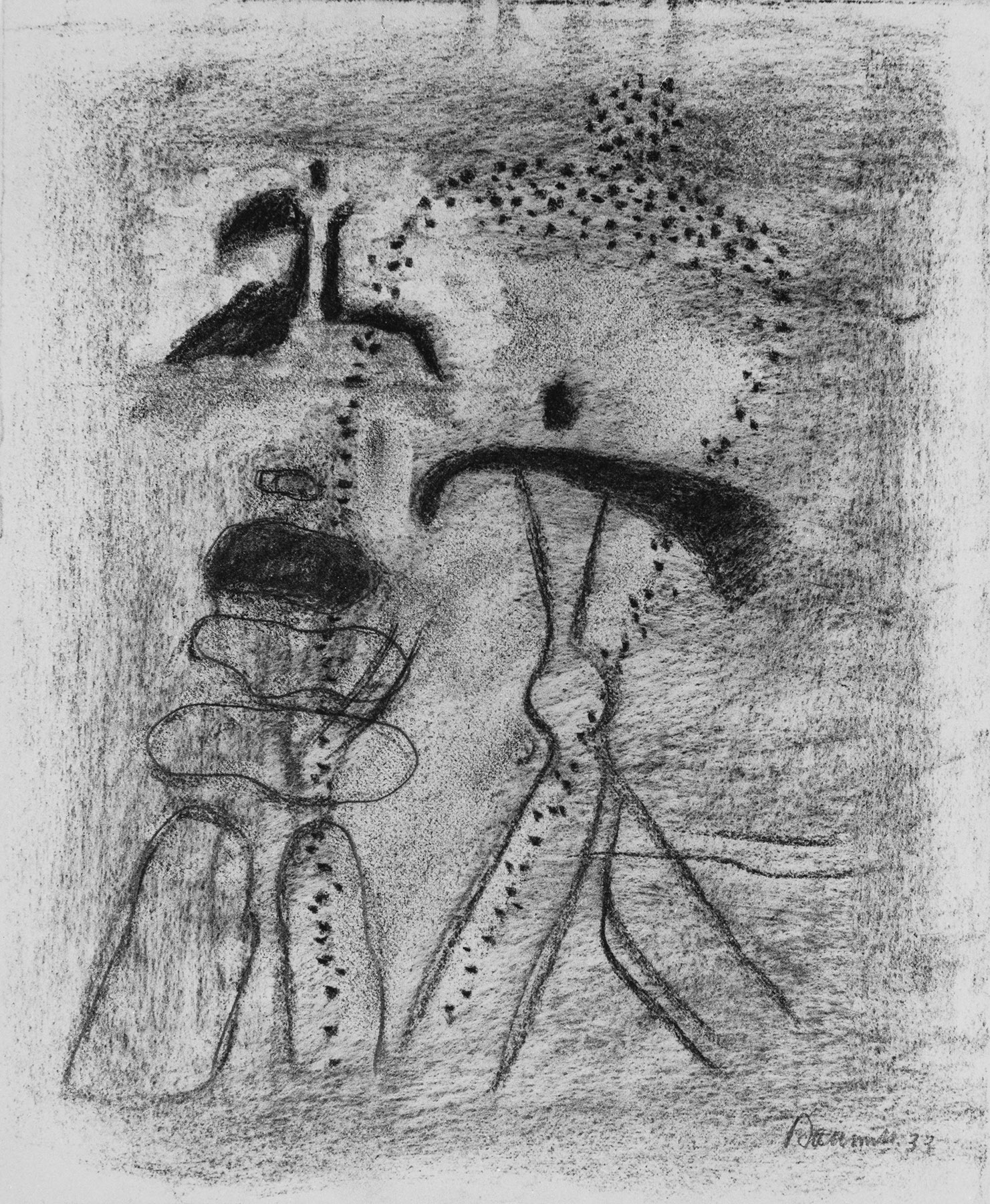 Kohle, z. T. gewischt, Bleistift, fixiert, auf chamoisfarbigem Aquarellkarton