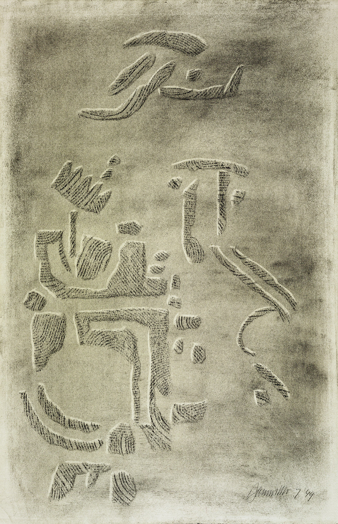 Kohle, gewischt, radiert, Ölkreide in Schwarz, durchgerieben, fixiert, auf lindgrünem Ingres-Bütten mit Wz. I.u.: PMF (ITALIA)
