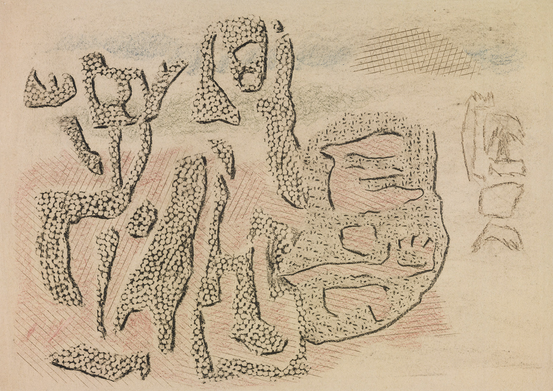 Kohle, gewischt, Ölkreide in Schwarz, Braun, durchgerieben, Rot, Blau, Grün, auf braunrosafarbigem Maschinen-Bütten (Vorsatzpapier) mit Wz. l. Mitte, r. Mitte, Rand l. o., r. (angeschnitten): Rosette, darunter Textwort (unleserlich)