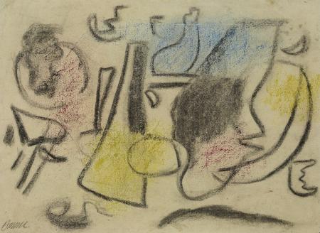 Kohle, Kreiden in Krapplack, Gelb, Blau, auf gelblichem Bütten