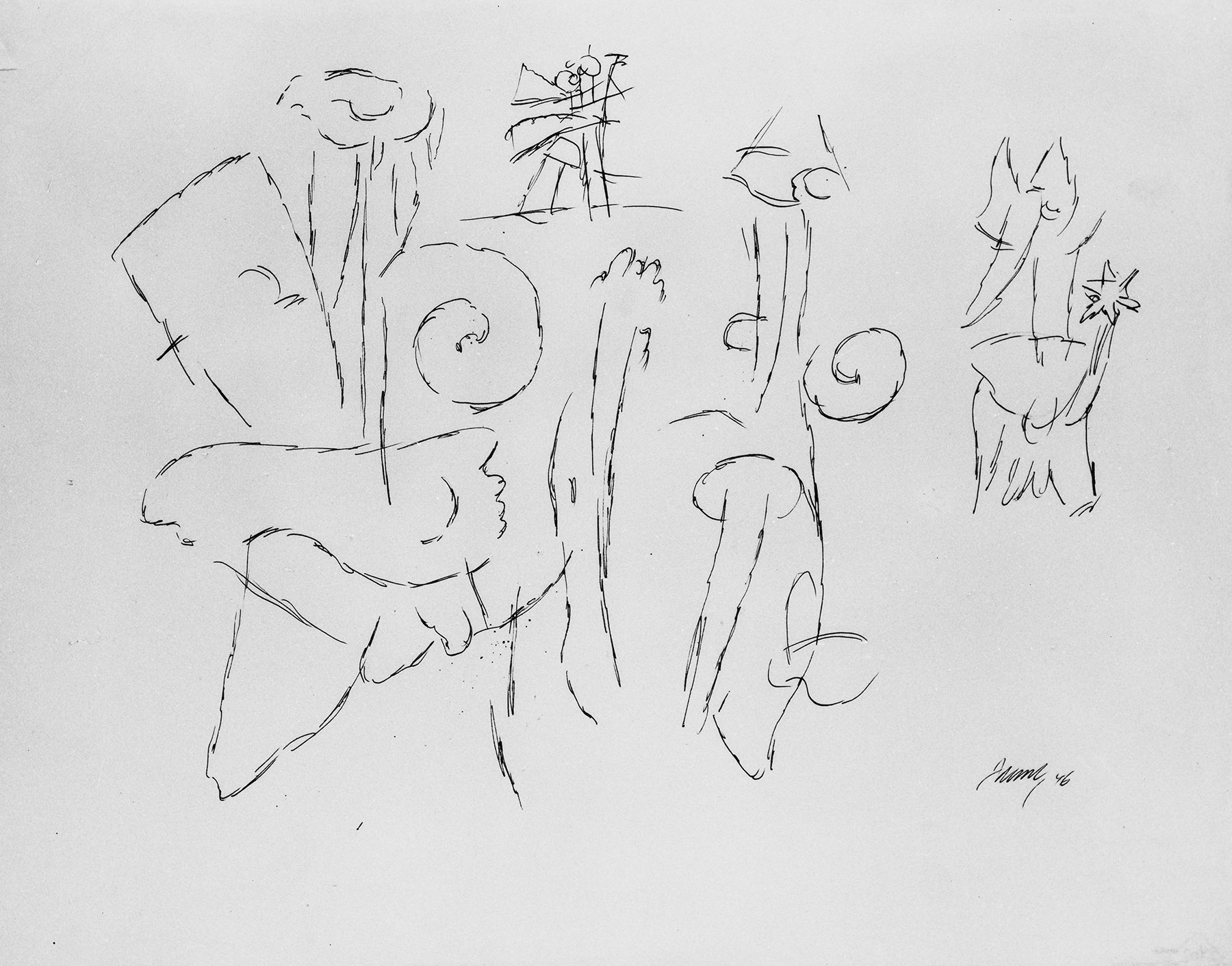 Feder in schwarzer Tusche, auf chamoisfarbigem, durchscheinendem, am Rand o. unregelmäßig gerissenem Schreibpapier mit Wz. u.: DYNAMIK . HARTPOST