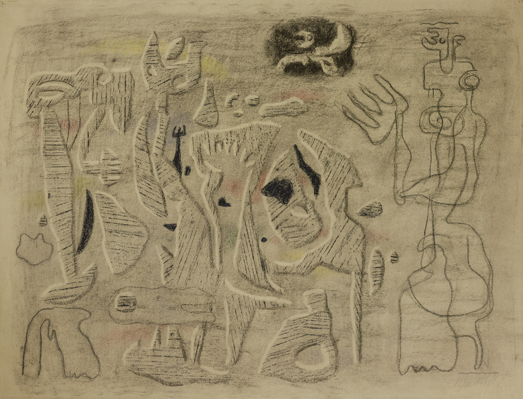 Kohle, gewischt, radiert, Ölkreide in Schwarz, durchgerieben, Rot, Blau, Grün, Gelb, fixiert, auf braunem Ingres-Bütten