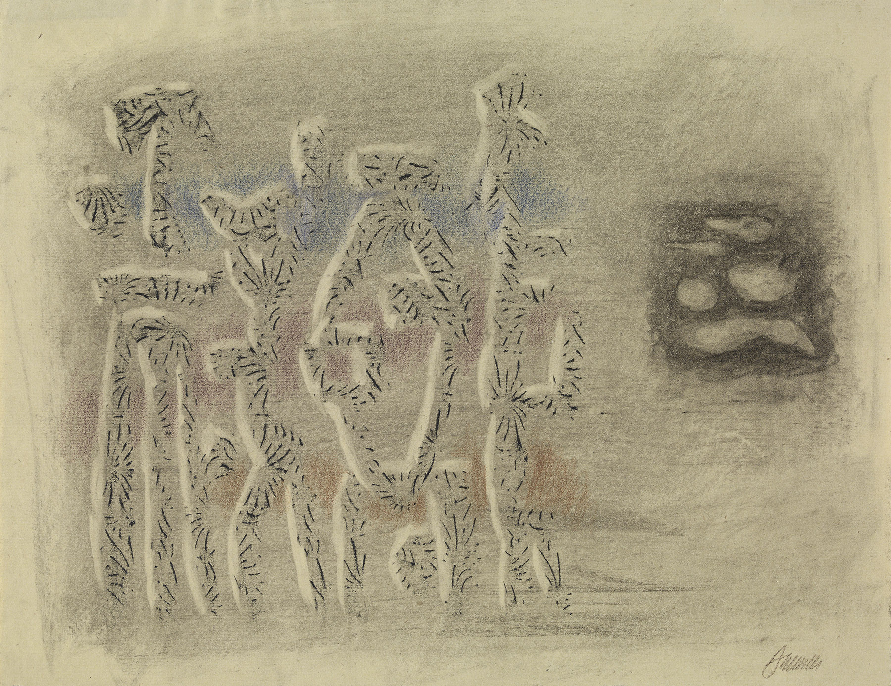Kohle, gewischt, radiert, Ölkreide in Schwarz, durchgerieben, Blau, Rot, Orange, fixiert, auf gelblichem, am Rand u. leicht unregelmäßig gerissenem Ingres-Bütten