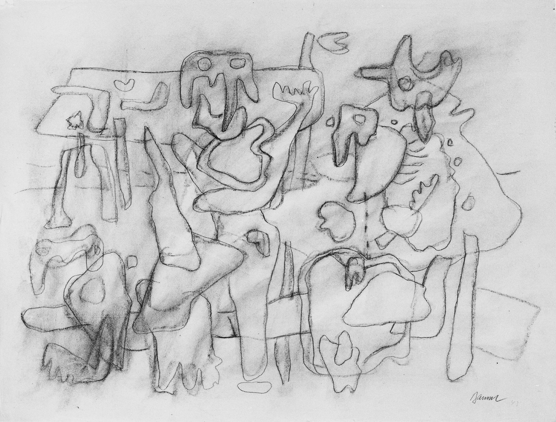 Kohle, z. T. gewischt, Bleistift, fixiert, auf chamoisfarbigem Ingres-Bütten mit Wz. r. u.: INGRES
