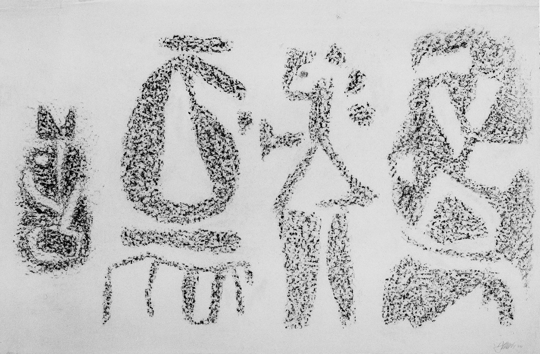 Kohle, gewischt, Ölkreide in Schwarz, Braun, Blau, Ocker, Grün, durchgerieben, auf chamoisfarbigem Ingres-Bütten