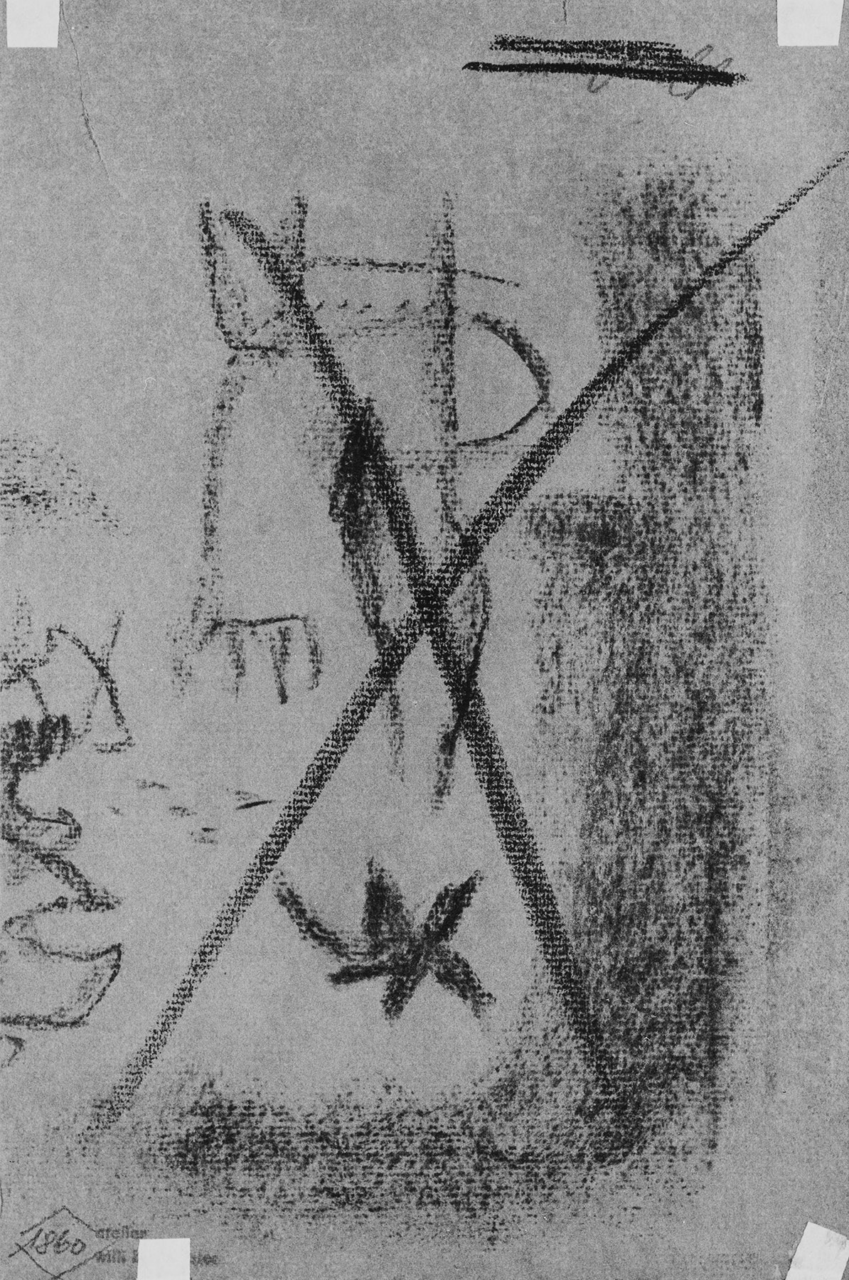 Kohle, Pastell in Gelb, Orange, Graublau, fixiert, auf hellbraunem Ingres-Bütten