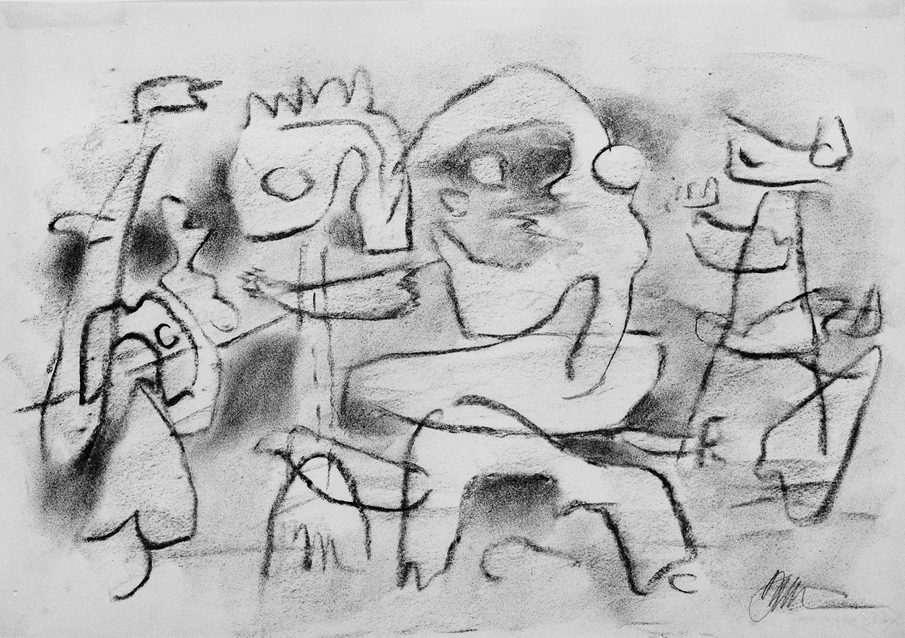 Kohle, gewischt, fixiert, auf chamoisfarbigem, dünnem, am Rand u. zur Ecke r. unregelmäßig im scharfen Knick abgetrenntem Zeichenpapier
