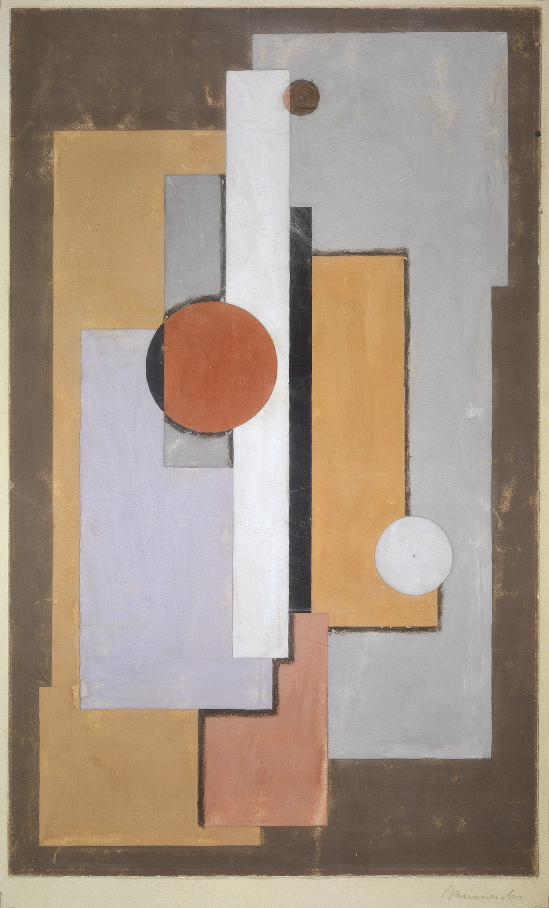Bleistift, unter Verwendung von Zirkel und Lineal, Deckfarbe in Rot, Rosa, Orange, Braun, Grau, Weiß und Schwarz, auf chamoisfarbigem Zeichenkarton, aufgelegt auf chamoisfarbigen Karton mit Markierungen für die Passepartoutränder