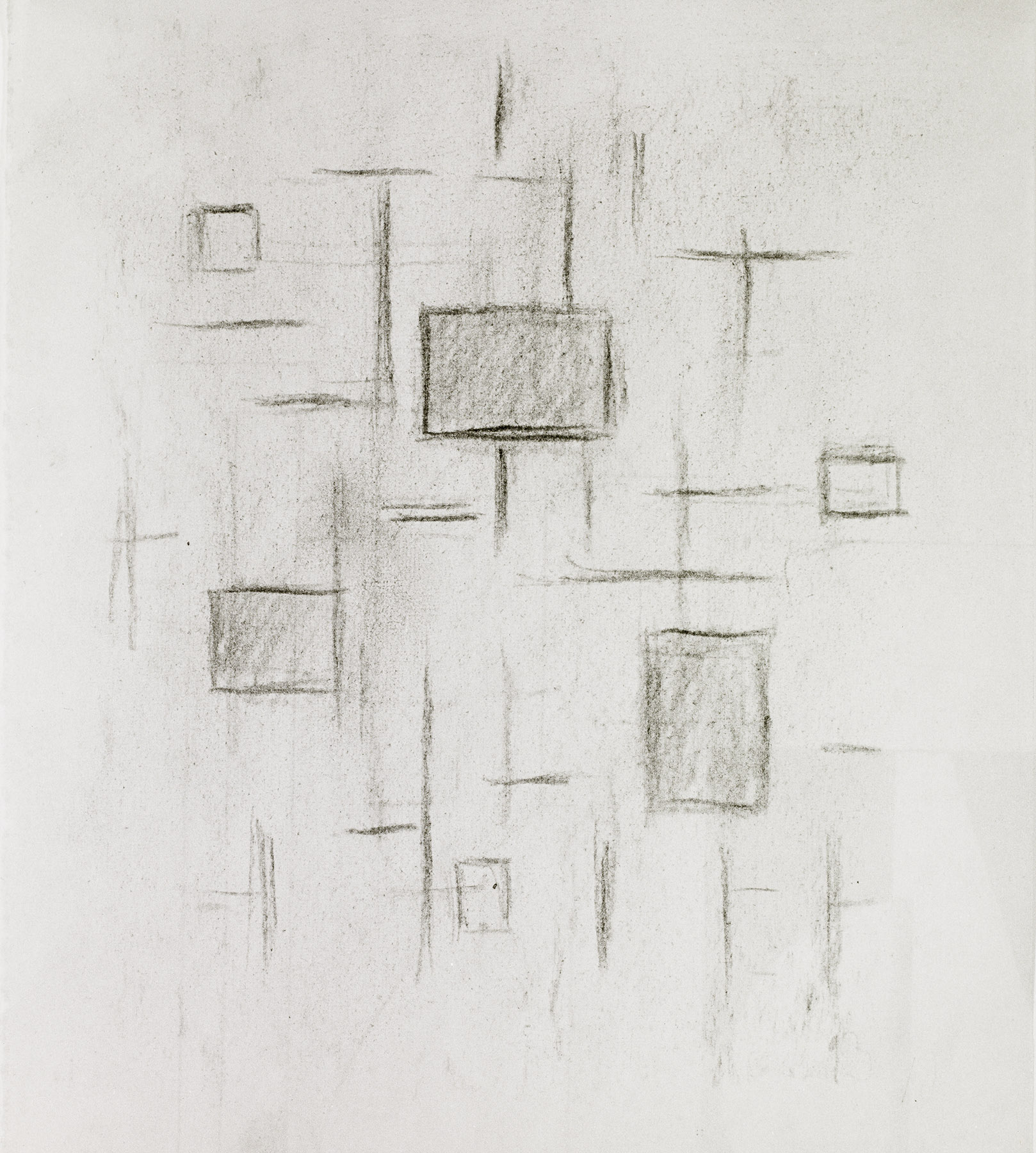 Kohle, gewischt, fixiert, auf chamoisfarbigem, imitiertem Japanpapier