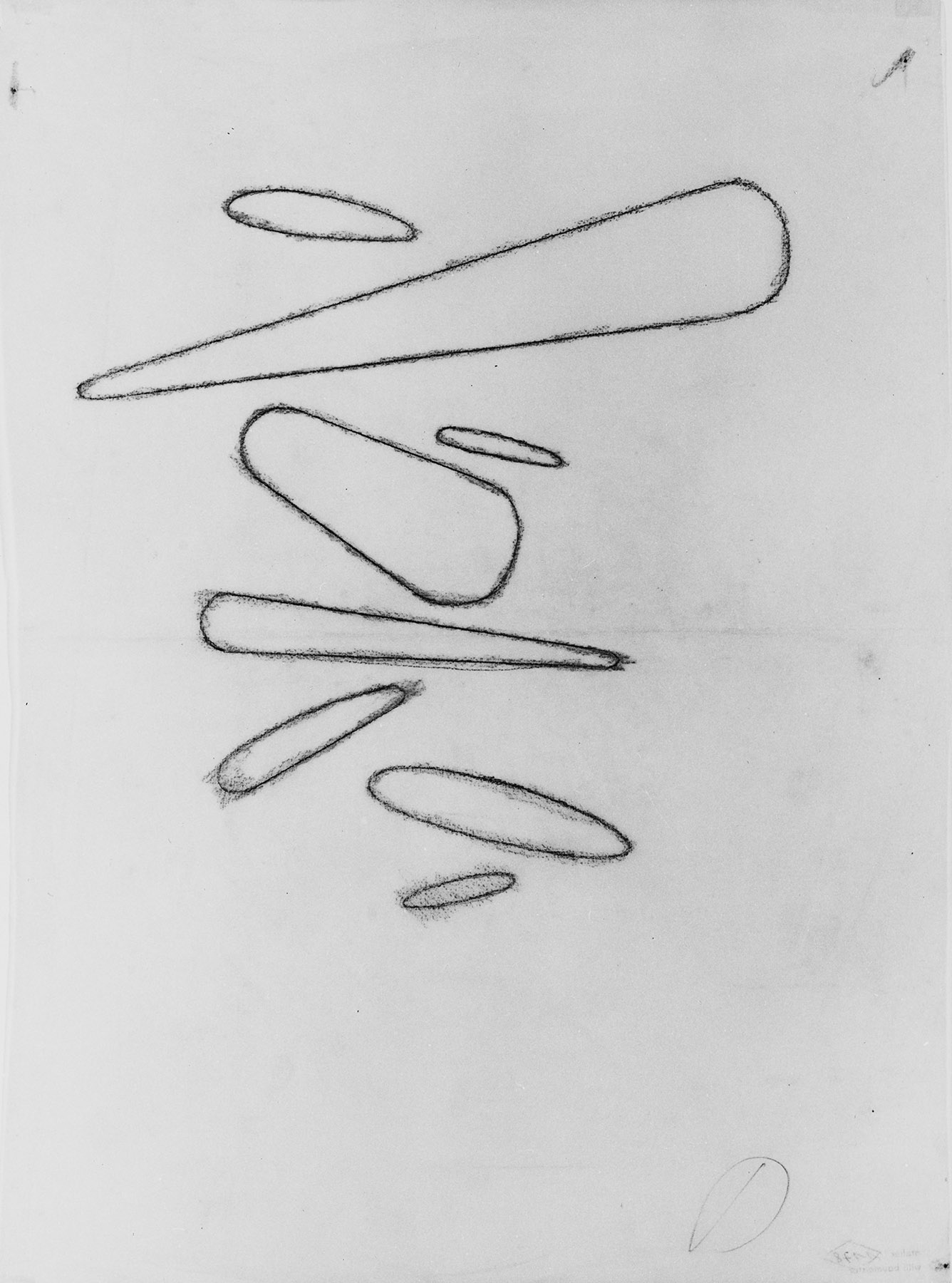 Vgl. die Lithographien Sp 216, 295 von 1937/38 und die Gemälde G 481-484 von 1938. (fkb) Vgl. die didaktische Skizze Baumeisters mit dem erklärenden Text: „Fliegende Formen / Räumliche lllusion", die er zusammen mit zwei weiteren Skizzen, vgl. Z 652 und 697, auf einen Fotokarton klebte (Archiv Baumeister). (fkb)