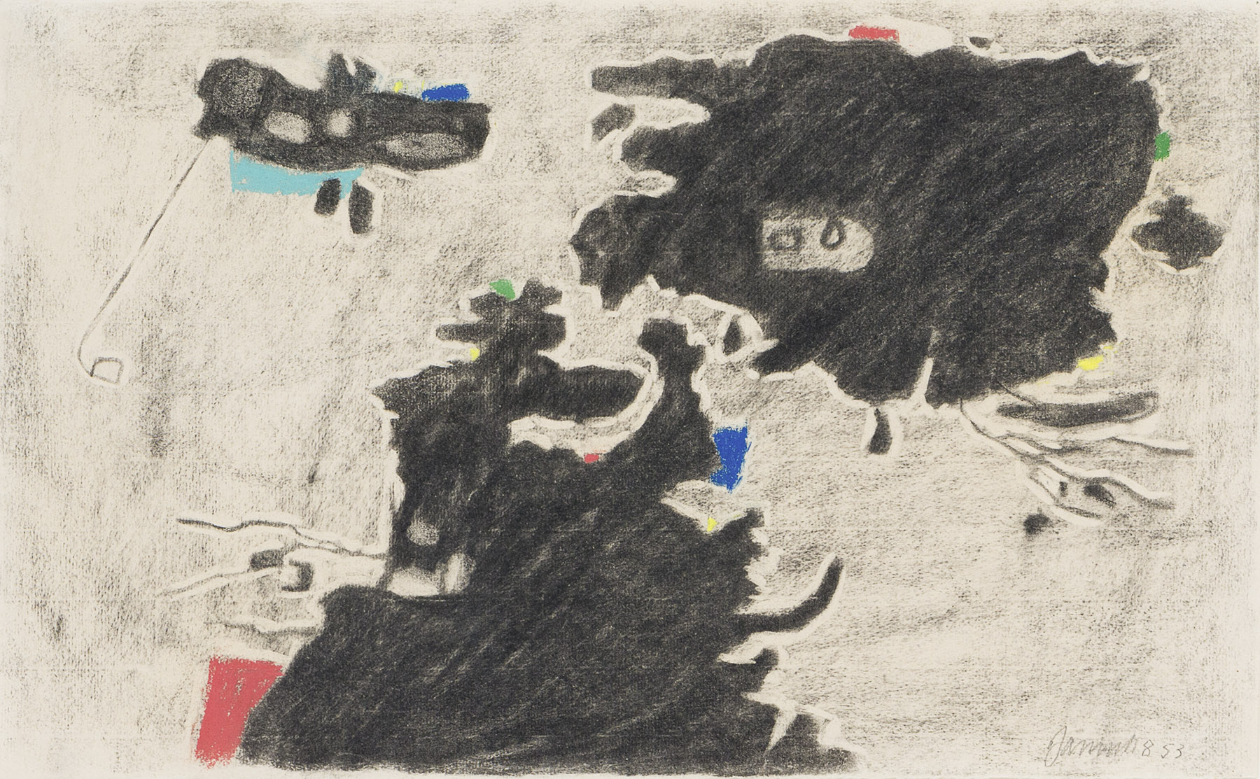 Kohle, gewischt, radiert, Pastell in Türkis, Rot, Gelb, Ocker, Grün, fixiert, auf chamoisfarbigem Ingres-Bütten