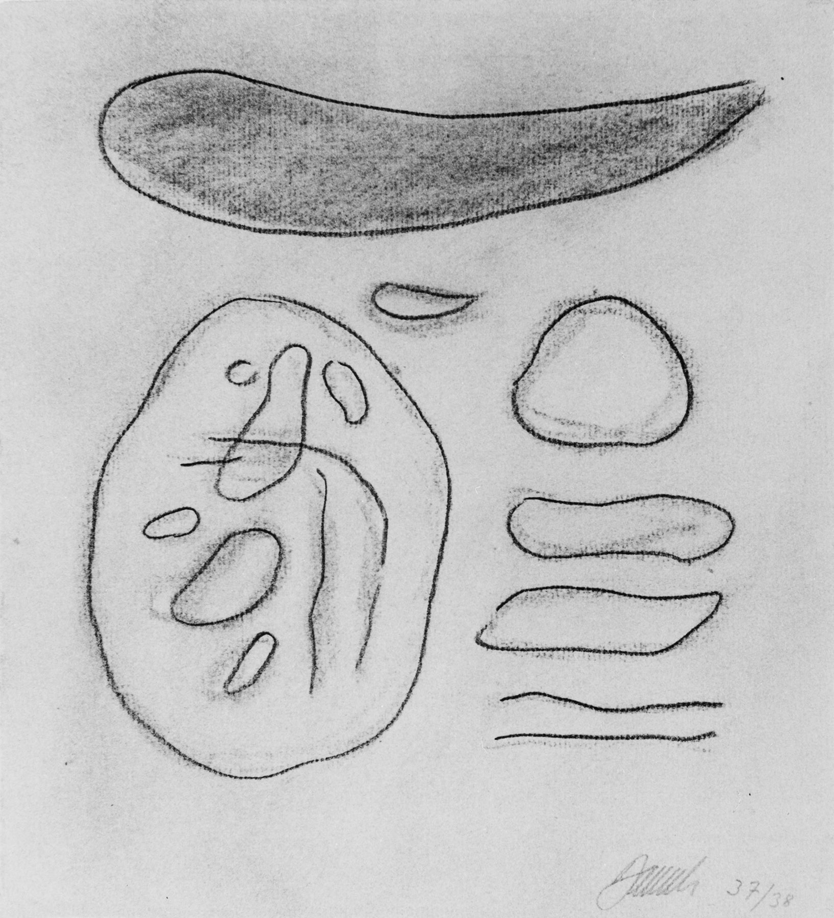 Kohle, z. T. gewischt, Ölkreide in Schwarz, fixiert, auf olivfarbigem Ingres-Bütten mit Wz. l. u.: ING...