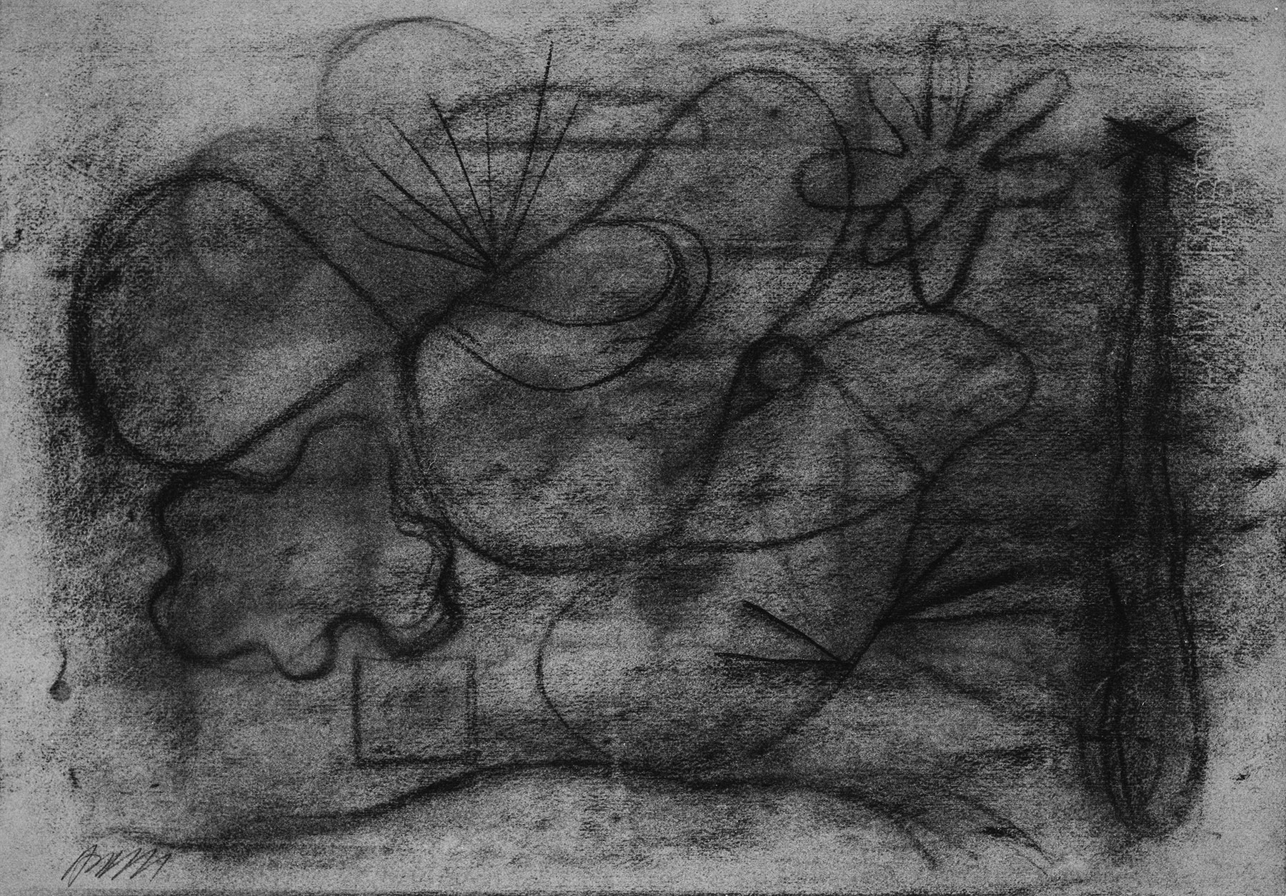 Kohle, gewischt, Ölkreide in Schwarz, Konturen blind über die Ölkreide-Konturen gelegt, fixiert, auf graubraunem Ingres-Bütten mit Wz. r. o.: P. M. FABRIANO