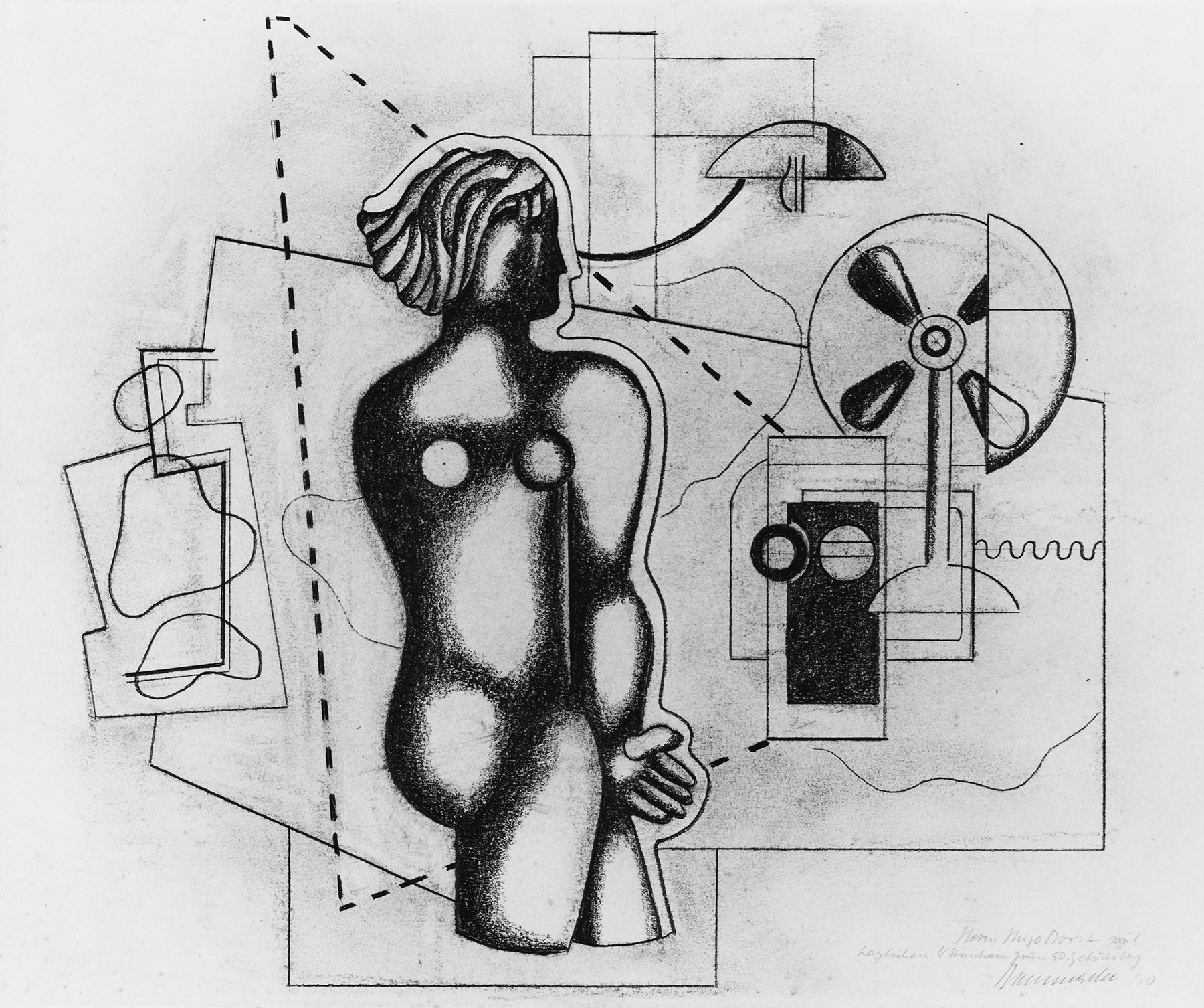 Von B. im Notizheft der „Fotos und Zeichnungen“ S. 4 aufgeführt: „2 Blätter Hugo Borst / 1. Fassung Frauenfigur mit Flügel-Ventilator Querformat /   2.       „              „                               „            / ca. 1930“. (fkb)   348 und 349: Hier verbindet sich das Element „Weiblicher Akt“ im plastisch-realistischen Stil mit Elementen aus der konstruktivistischen Phase, wie sie in den „Maschinen“ von Ventilatoren und Grammophon angedeutet sind.