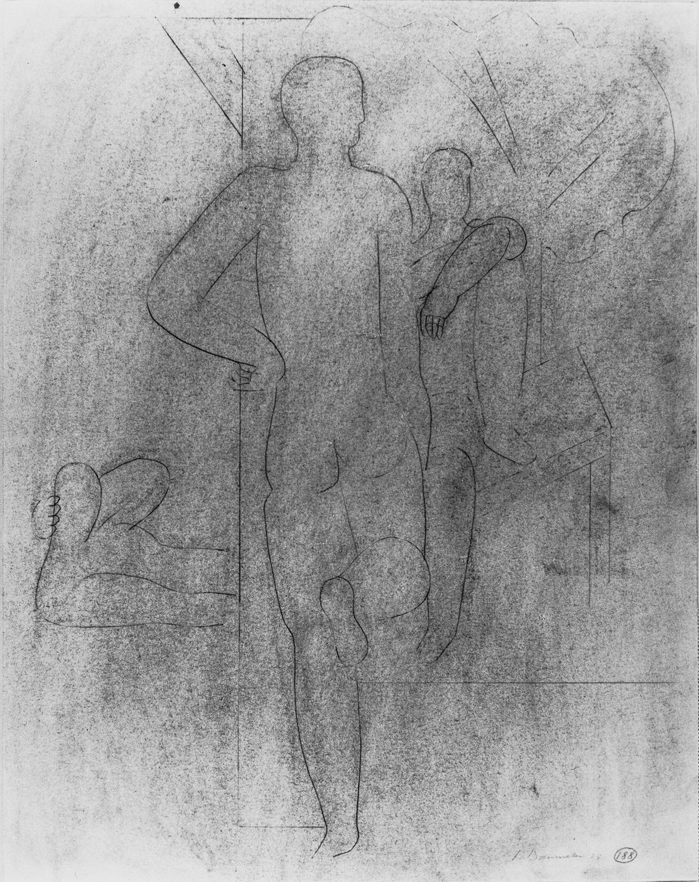 Bleistift, unter Verwendung des Lineals, Kohle, gewischt, fixiert, über schwacher Skizze in Kohle (mit Abweichungen), Linien und Kurven geritzt, auf chamoisfarbigem, am Rand l. o. und r. perforiertem Zeichenkarton