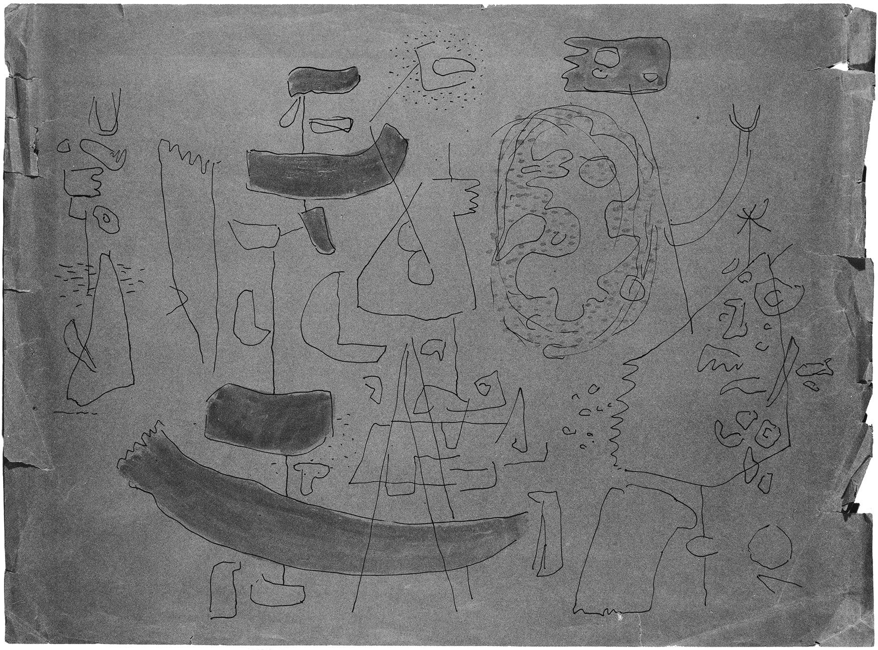 Feder in Ausziehtusche in Schwarz, grau laviert, auf olivgrünem Tonpapier
