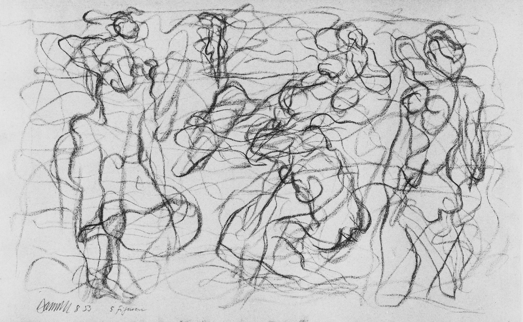 Erklärungs-Skizze, doppelseitig (Zusatzabbildung). Bleistift auf Zeichenpapier, l. u. auf die Unterlage von Z 2176 geklebt. 120 x 162 mm. Bez. recto l. u. „Erklärungs-Skizze“, Aufschrift von fremder Hand verso: Umstehende Zeichnung / für, unten bez. „Karl Ströher als Skizze / zum Studien-Blatt „5 Figuren“ /1953“.