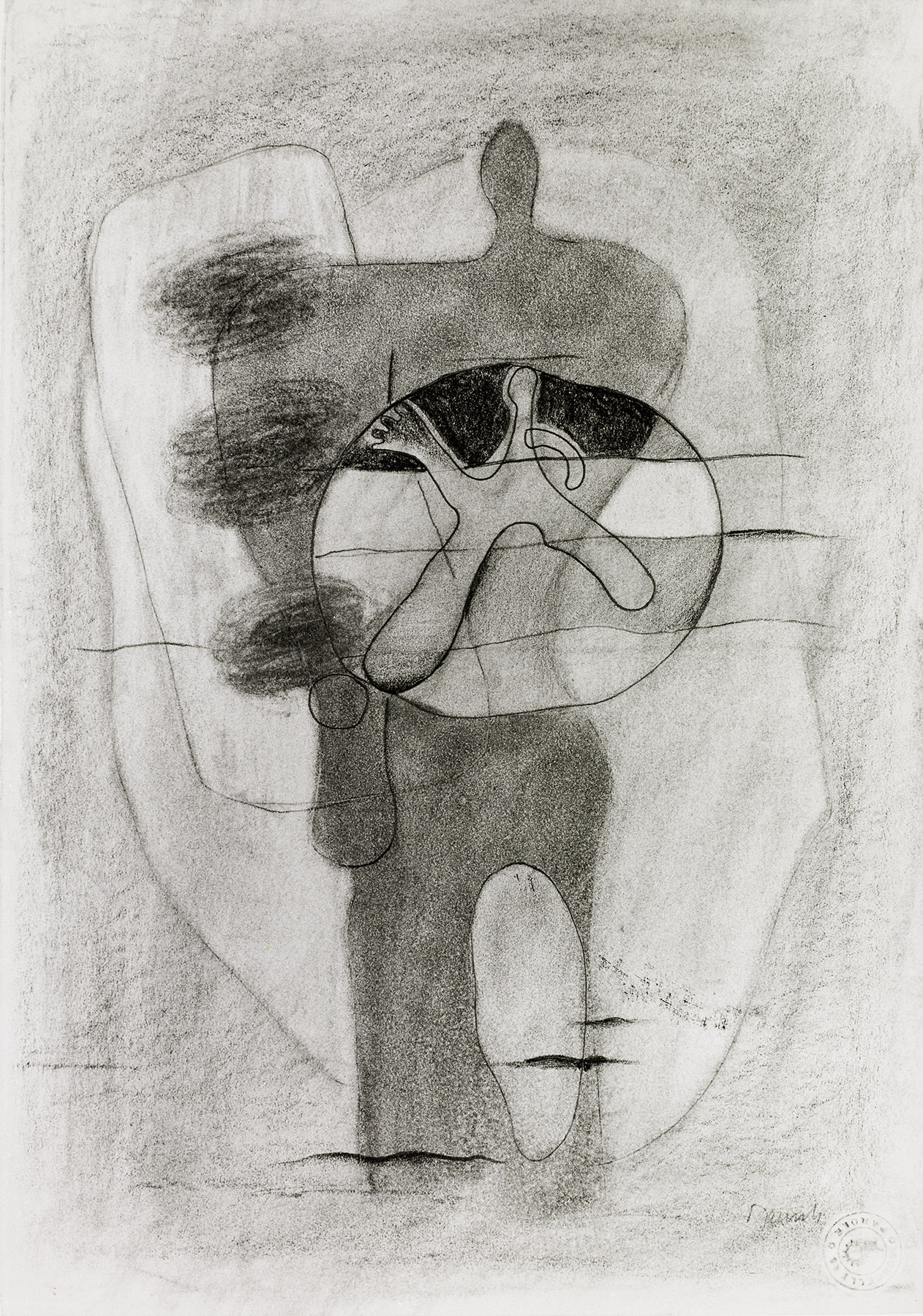 Bleistift, Kohle, gewischt, Ölkreide in Blau, Rot, Gelb, Ocker, Konturen stark eingedrückt (mit Abweichungen), fixiert, auf chamoisfarbigem, dünnem Zeichenkarton mit Prägestempel r. u.: SCHOELLERS PAROLE