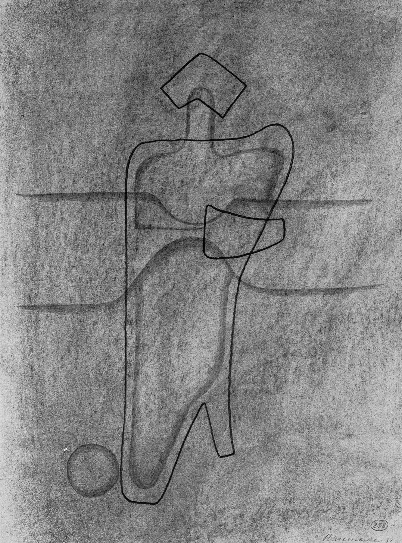 Bleistift, Kohle, gewischt, fixiert (Kohle nur in der Wischung), Konturen vorgeritzt, unter allem blinde (hell ausgespart) Konturen schwach sichtbar (durchgedrückt vom vorangehenden Blatt im Block?), Einfassungslinien (einfach), auf chamoisfarbigem, am Ra