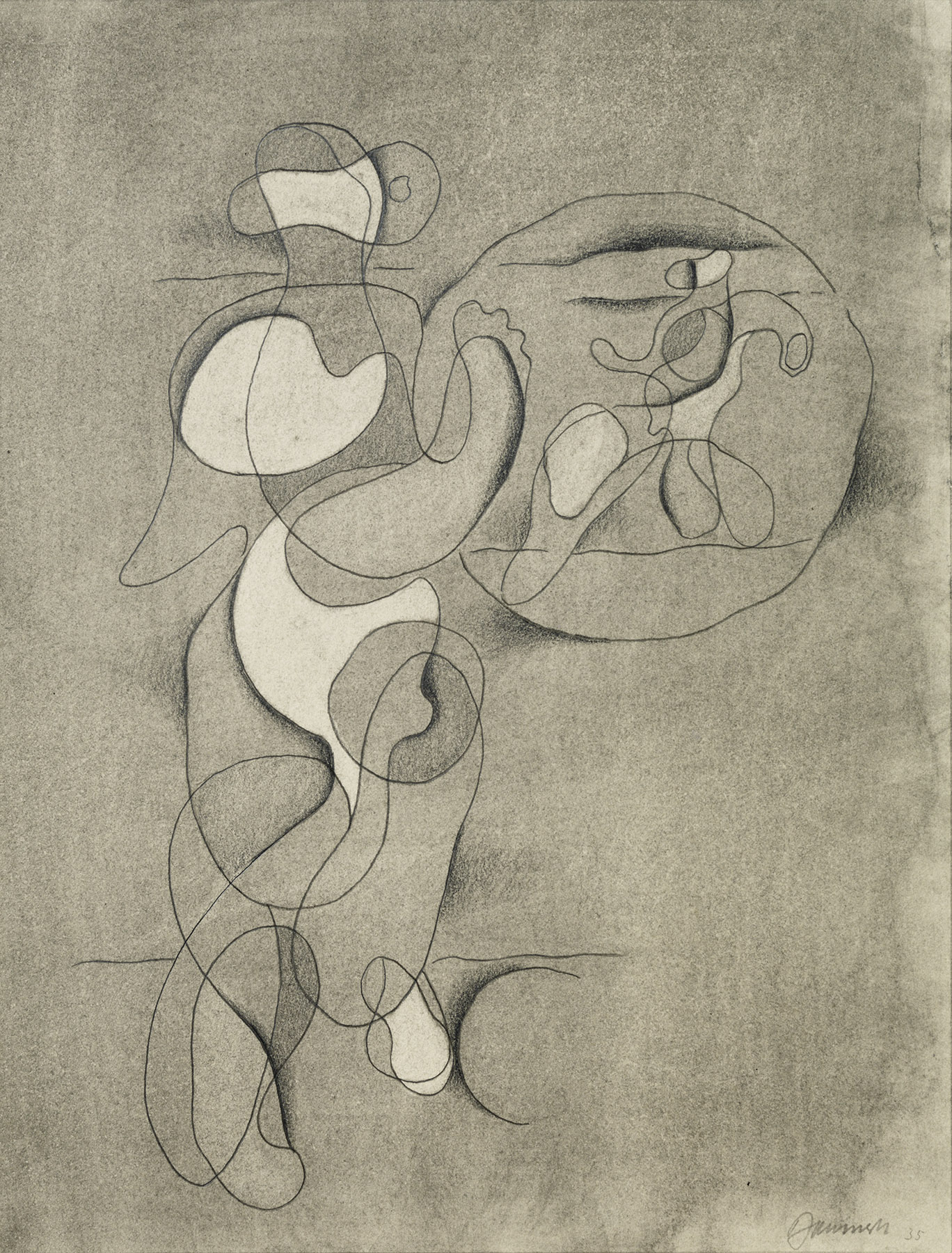 Kohle, gewischt, Bleistift, Konturen vorgezeichnet und eingedrückt, fixiert, Einfassungslinien, auf chamoisfarbigem, am Rand l. perforiertem Zeichenkarton