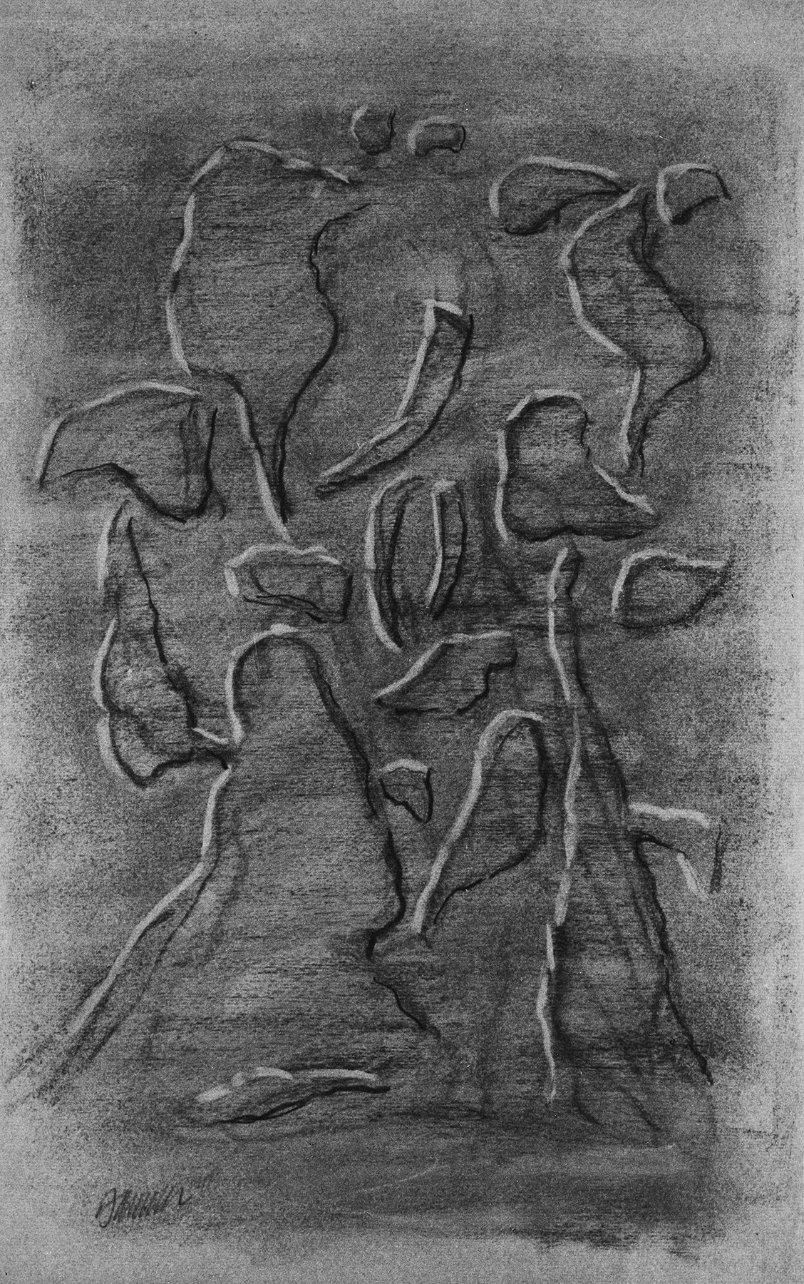 Kohle, gewischt, radiert, Pastell in Gelb, Orange, fixiert, auf graugrünem am Rand l. perforiertem Ingres-Bütten