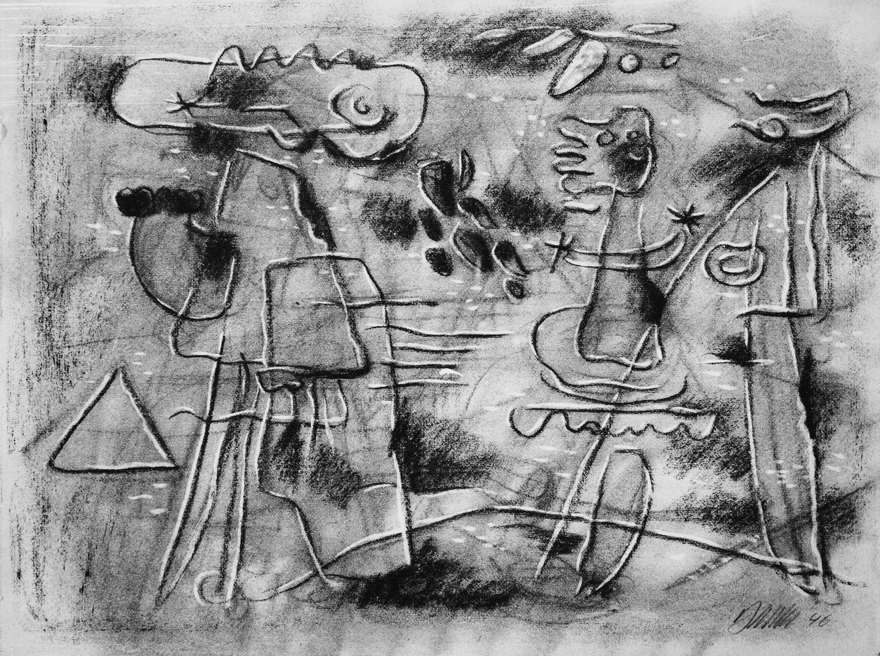 Kohle, gewischt, radiert, auf elfenbeinfarbigem Bütten