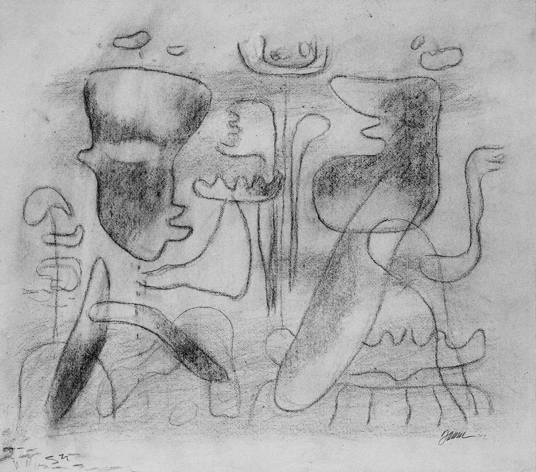 Kohle, z. T. gewischt und radiert, Ölkreide in Grün, Orange, Ocker, Braun, Rot, fixiert, auf chamoisfarbigem Ingres-Bütten