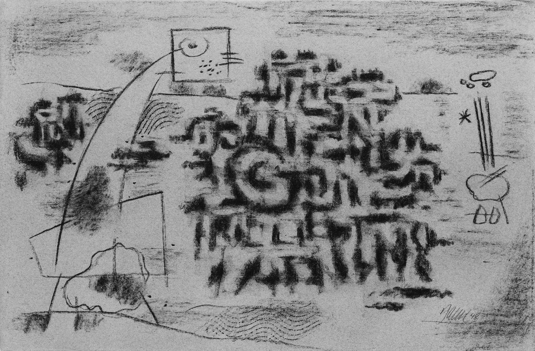 Kohle, z. T. gewischt, radiert, fixiert, Ölkreide in Schwarz, durchgerieben, auf hellblauem Ingres-Bütten mit Wz. l. o.: INGRES