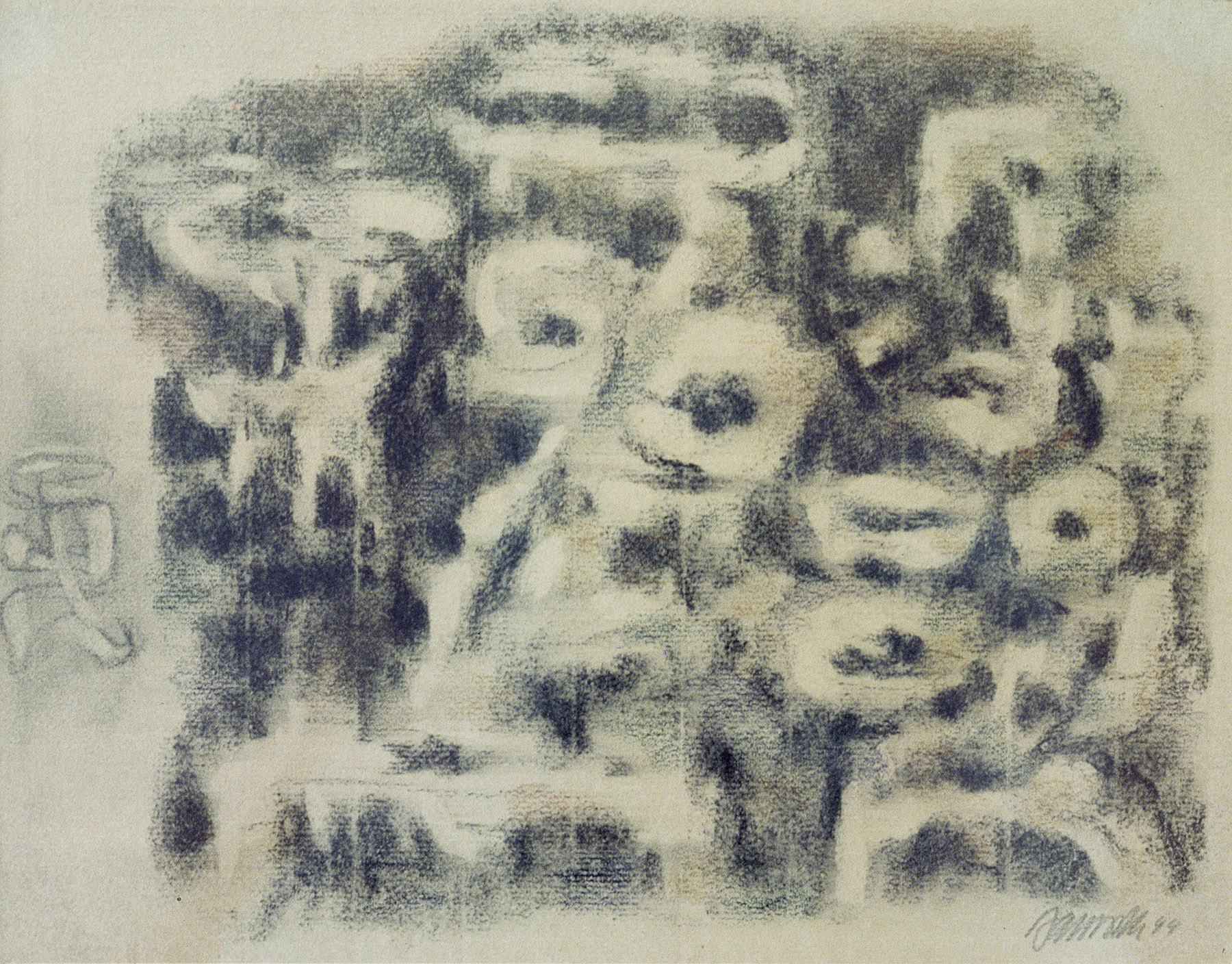 Kohle, gewischt, radiert, farbige Kreiden, auf Bütten
