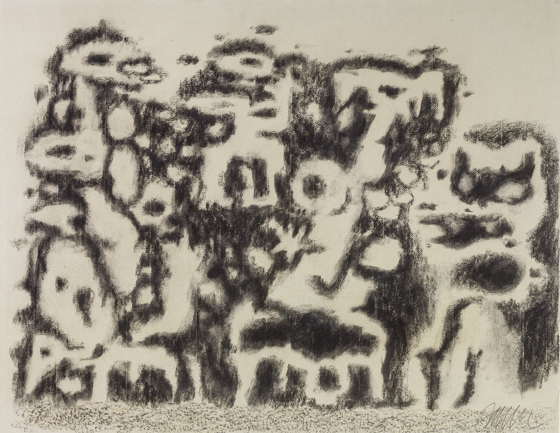 Kohle, z. T. gewischt, radiert, Ölkreide in Schwarz, Ocker, durchgerieben, fixiert, auf chamoisfarbigem Ingres-Bütten