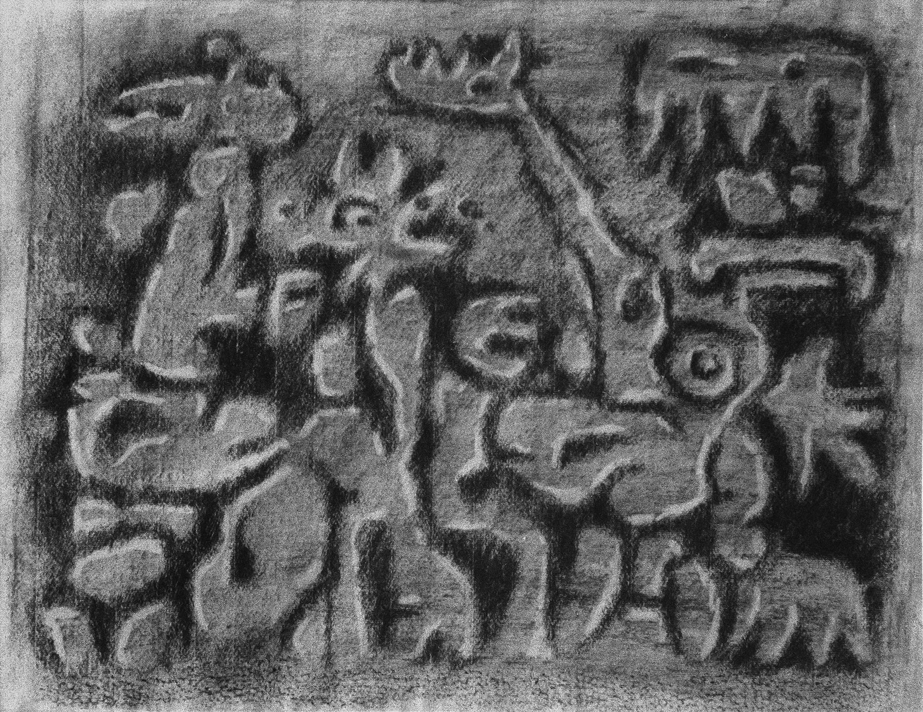 Kohle, gewischt, radiert, Ölkreide in Schwarz, durchgerieben, fixiert, auf braunem Ingres-Bütten