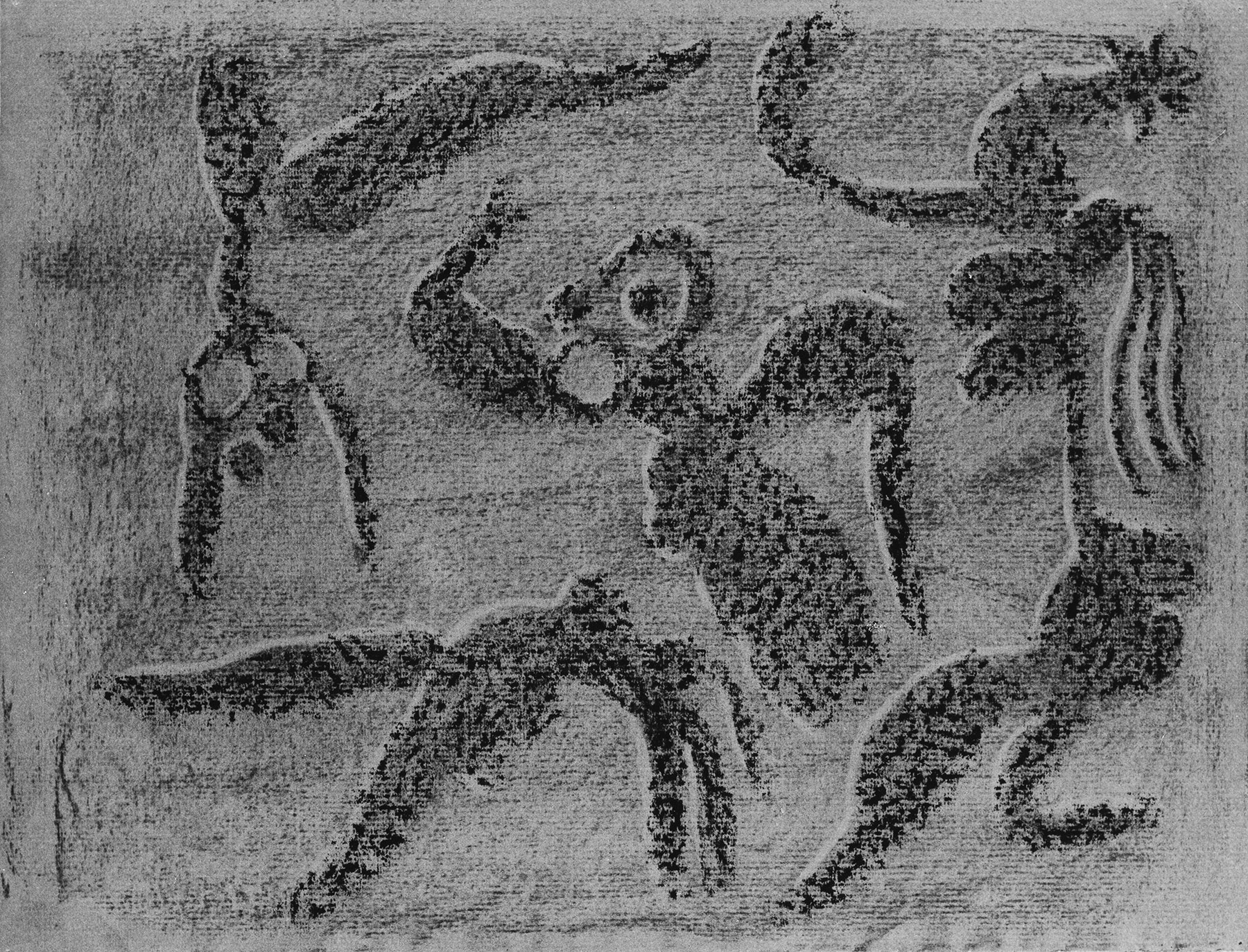 Kohle, gewischt, radiert, Ölkreide in Schwarz, durchgerieben, fixiert, auf hellbraunem, am Rand o. leicht unregelmäßig gerissenem Ingres-Bütten mit Wz. l. u.: PMF (ITALIA)