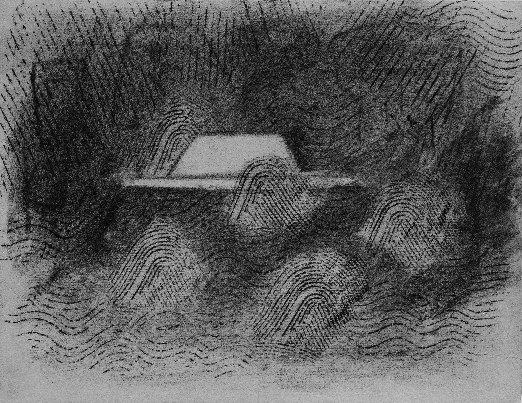 Kohle, gewischt, Ölkreide in Schwarz, durchgerieben, fixiert, auf gelblichem, stärkerem, holzhaltigem Zeichenpapier