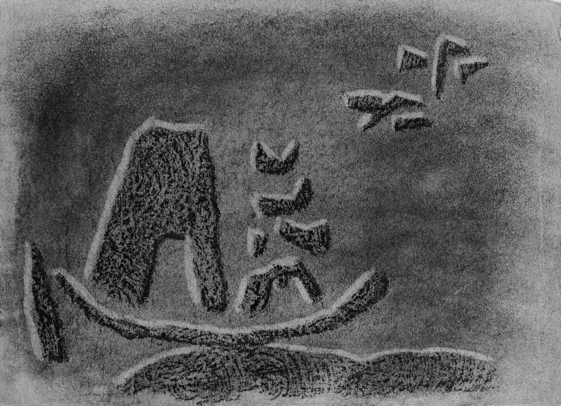 Kohle, gewischt, radiert, Ölkreide in Schwarz, fixiert, auf türkisgrünem Ingres-Bütten mit Wz. u. Mitte: Marghueriten-Blüte (angeschnitten)