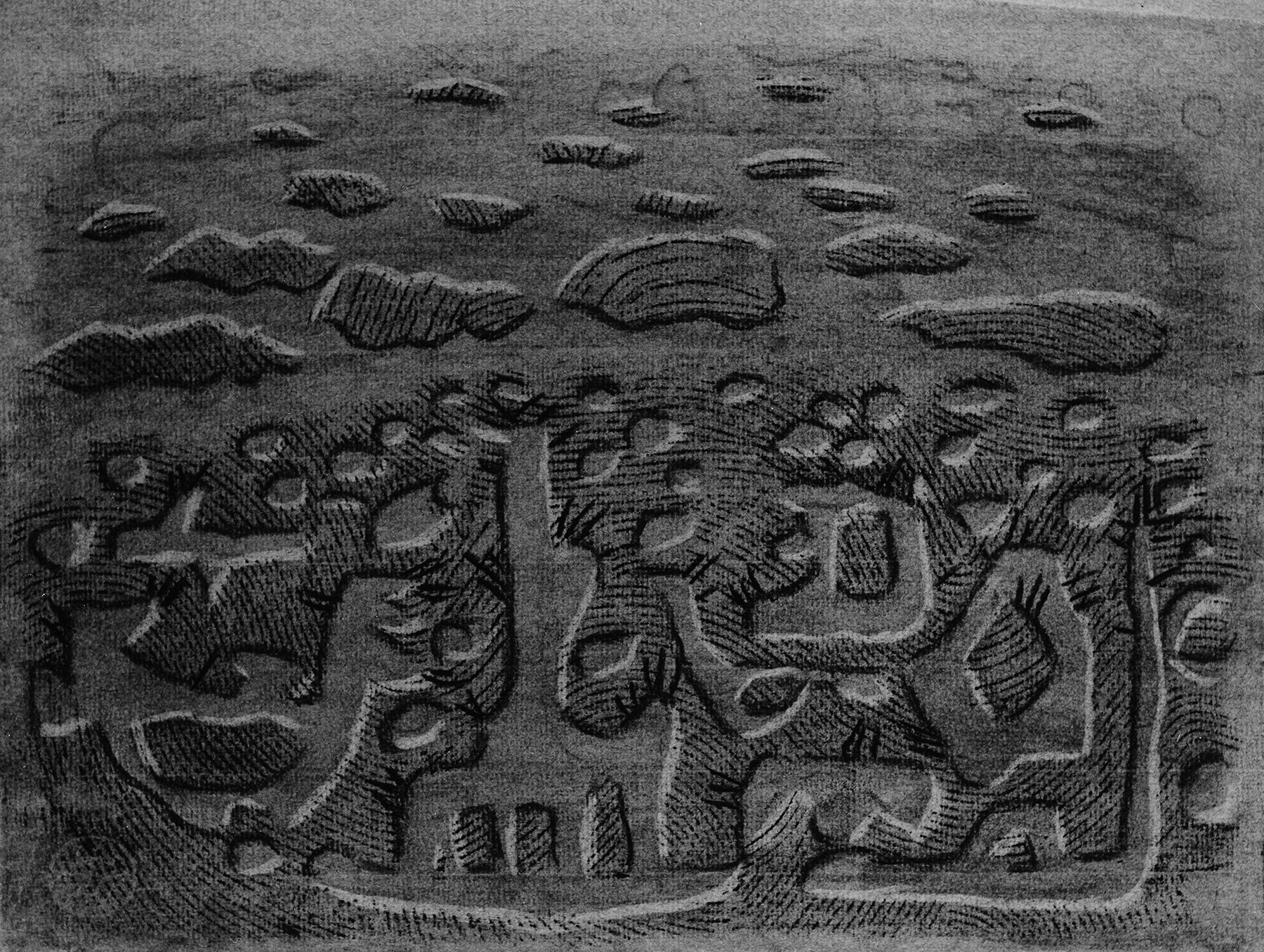 Kohle, gewischt, radiert, Ölkreide in Schwarz, durchgerieben, fixiert, auf blaugrünem Ingres-Bütten mit Wz. l. u.: Steigender Tiger im Kreis