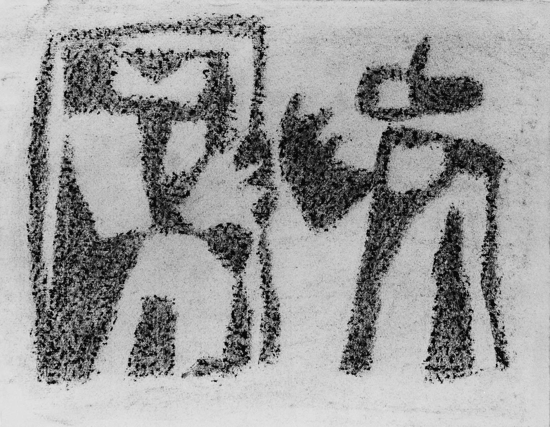 Kohle, gewischt, Ölkreide in Schwarz, durchgerieben, fixiert, auf chamoisfarbigem Ingres-Bütten