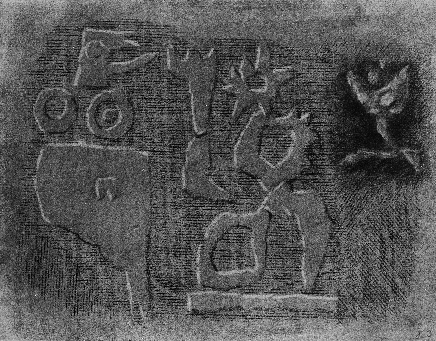 Kohle, gewischt, radiert, Ölkreide in Schwarz, durchgerieben, fixiert, auf grauviolettem Ingres-Bütten