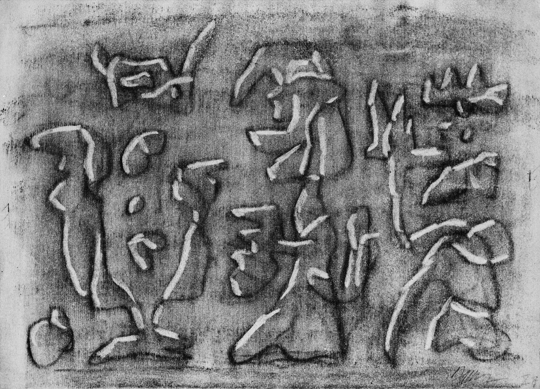 Kohle, gewischt, radiert, fixiert, auf chamoisfarbigem, starkem, genarbtem, am Rand r. und an der Ecke r. u. ungleichmäßig beschnittenem Aquarellpapier, Prägestempel am Rand l.: ... RS PAROLE (beschnitten)