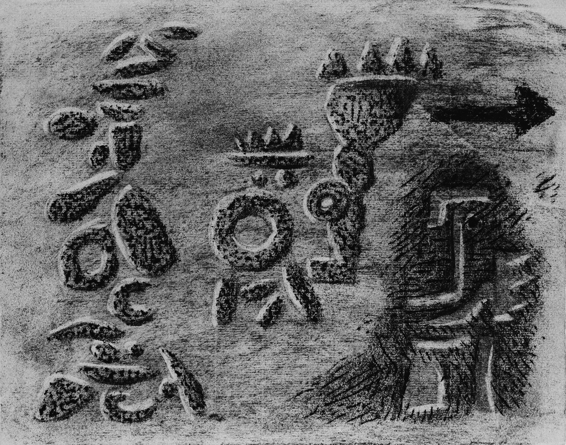 Kohle, gewischt, radiert, Ölkreide in Schwarz, z. T. durchgerieben, fixiert, auf lindgrünem Ingres-Bütten
