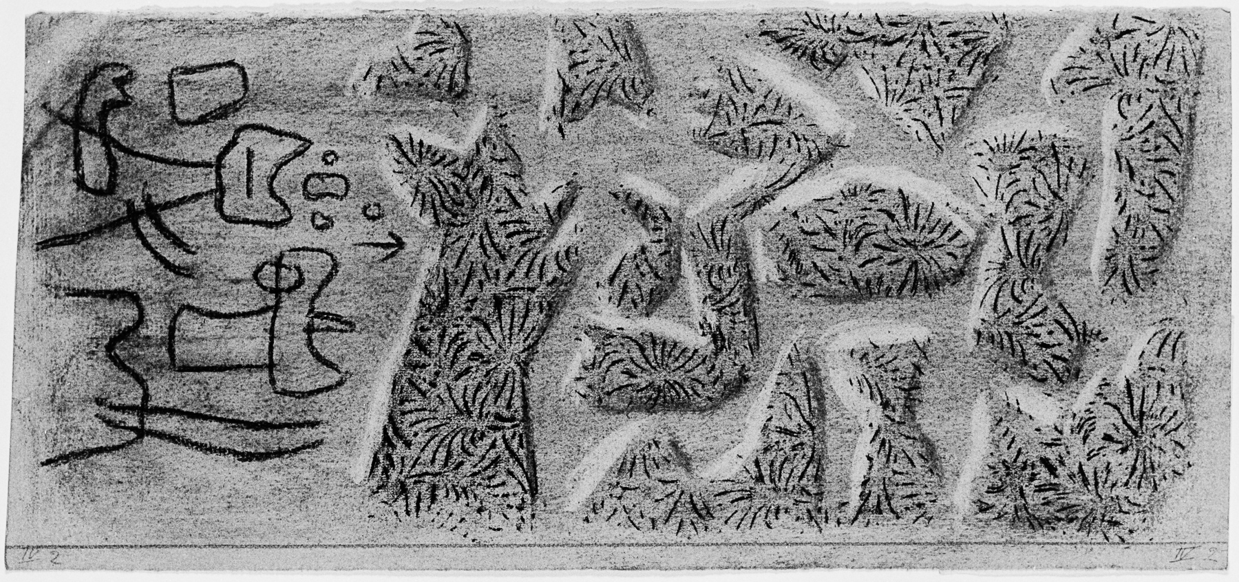 Kohle, gewischt, radiert, Ölkreide in Schwarz, durchgerieben, fixiert, Einfassungslinien in Bleistift, auf lindgrünem Ingres-Bütten, Rand l. schräg von r. o. nach l. u. beschnitten
