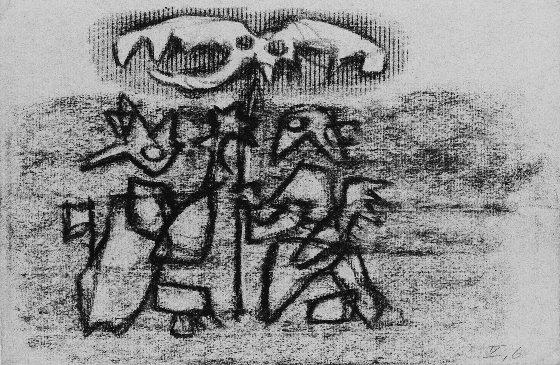 Kohle, gewischt, radiert, Ölkreide in Schwarz, durchgerieben, fixiert, auf lichtblauem Ingres-Bütten