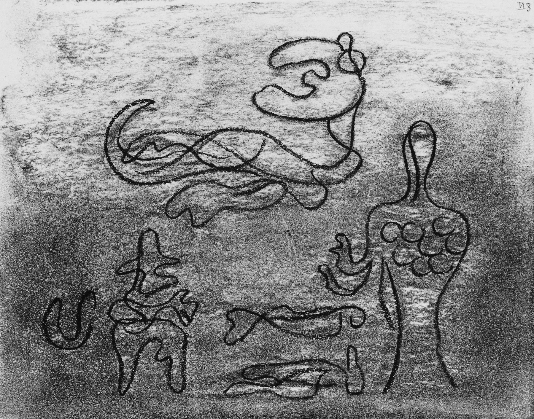 Kohle, gewischt, Ölkreide in Schwarz, fixiert, auf chamoisfarbigem Zeichenkarton