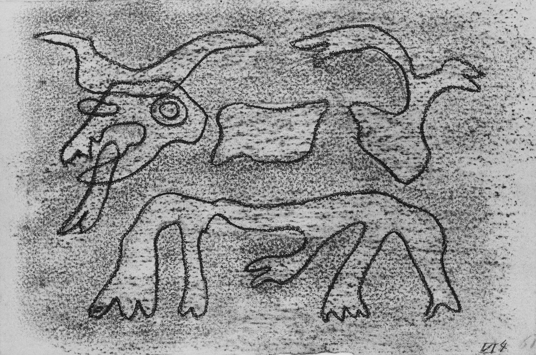 Kohle, gewischt, Ölkreide in Schwarz, Konturen zuvor mit hartem Bleistift z. T. blind vorgeritzt, fixiert, auf chamoisfarbigem, starkem, genarbtem Aquarellpapier, Rand u. leicht unregelmäßig gerissen