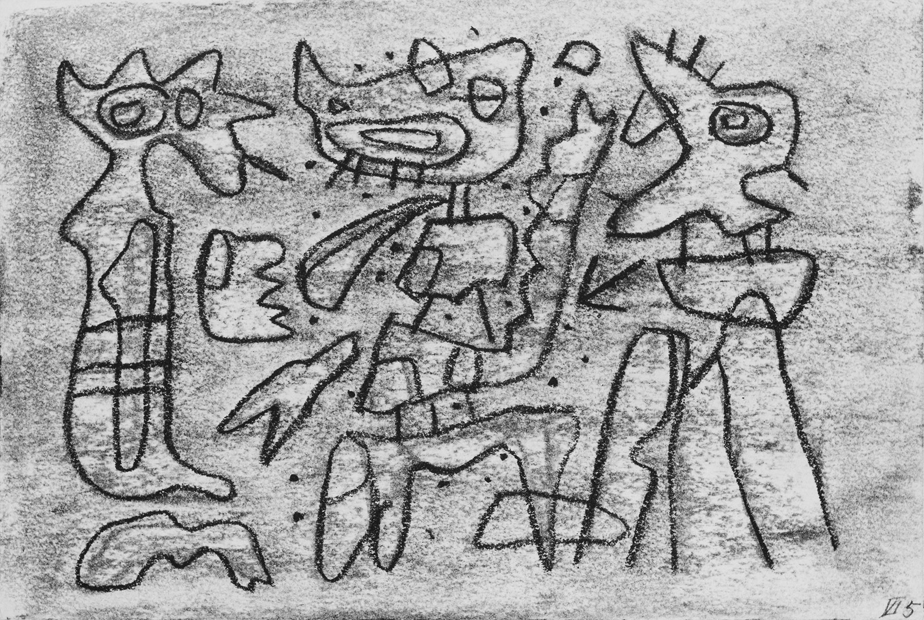 Kohle, gewischt, Ölkreide in Schwarz, darunter Skizze in Kohle mit Abweichungen, fixiert, auf chamoisfarbigem Zeichenkarton