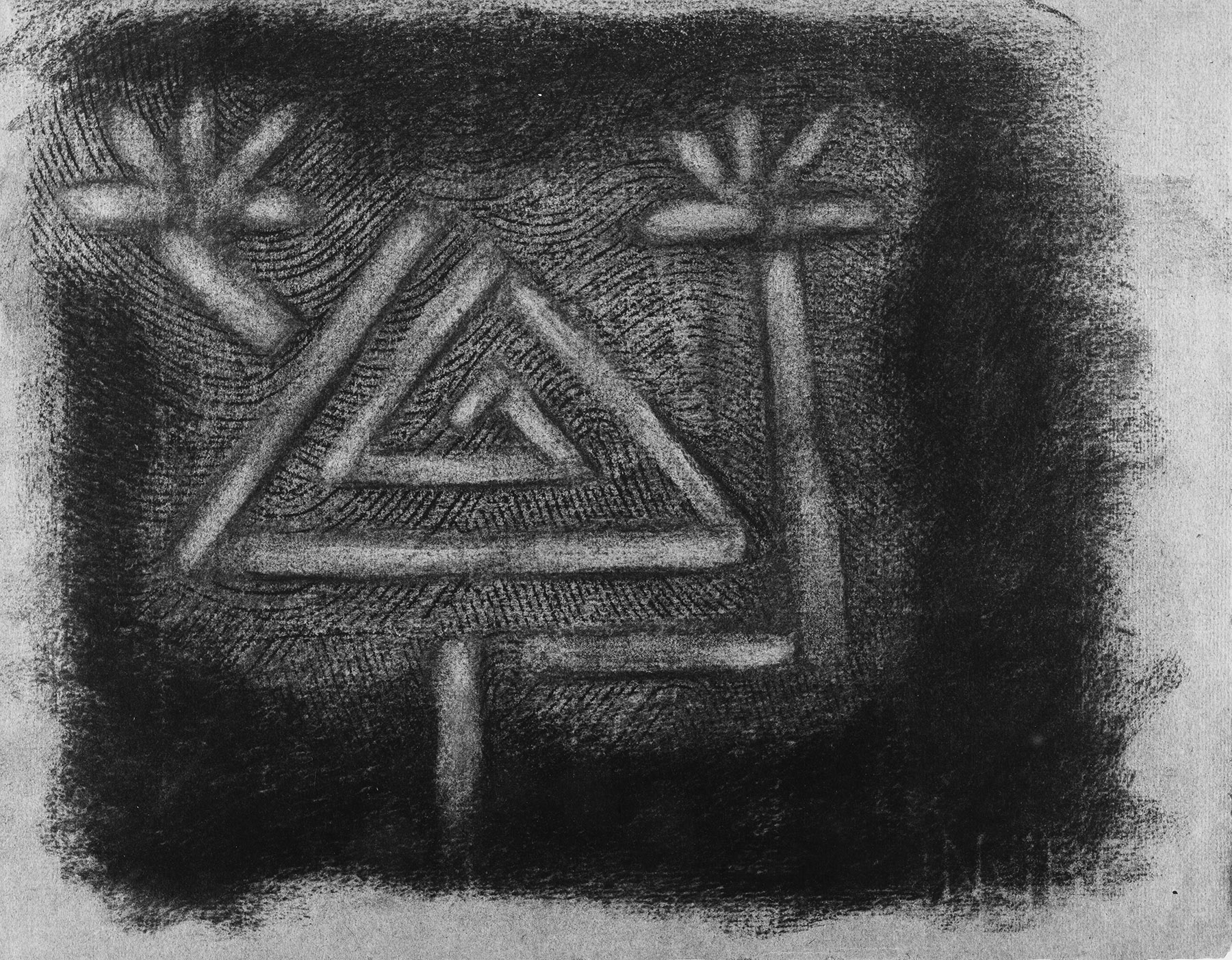 Kohle, gewischt, radiert, Ölkreide in Schwarz, durchgerieben, fixiert, auf sandgelbem Ingres-Bütten mit Wz. r. u.: INGRES